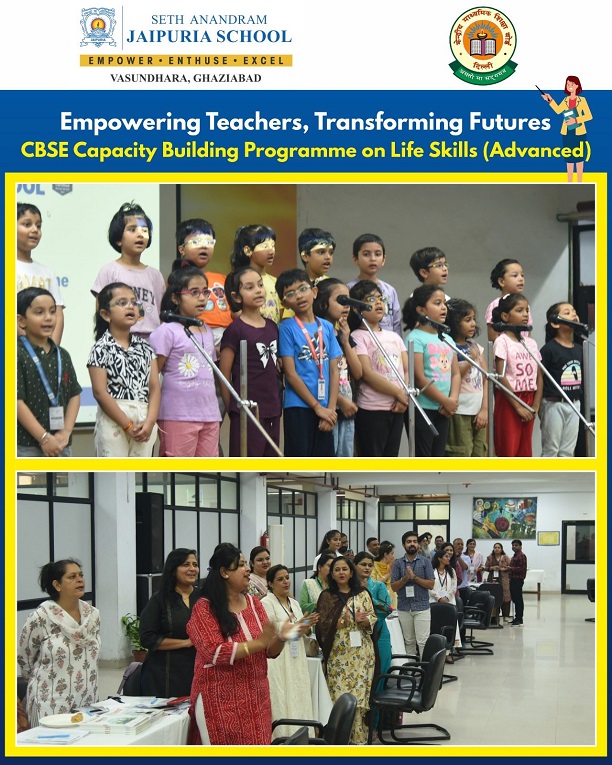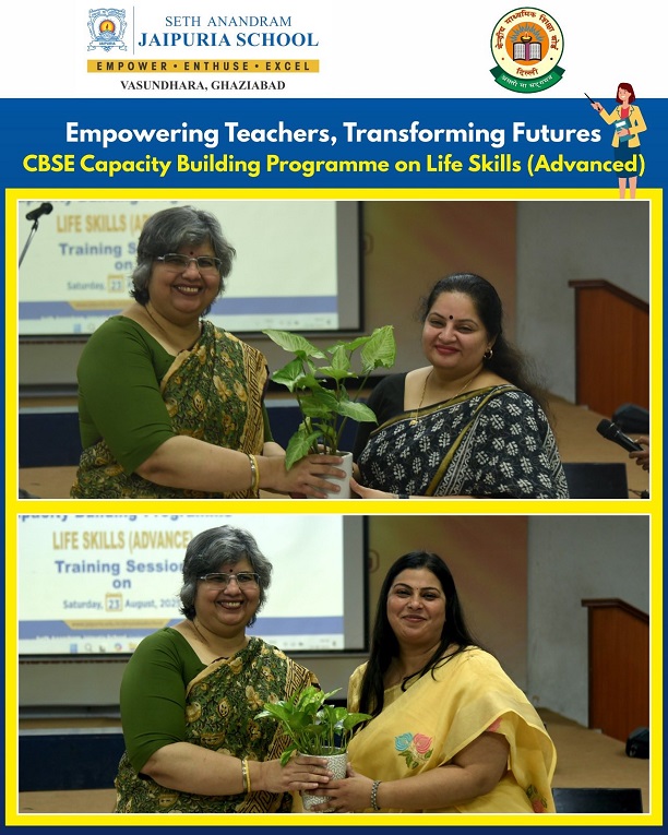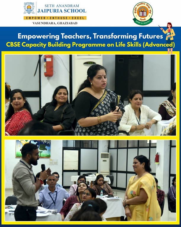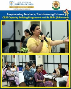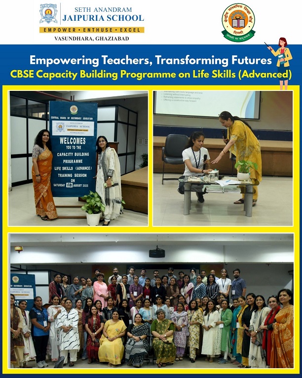 At Seth Anandram Jaipuria School, Vasundhara, Ghaziabad, we believe that empowered teachers create empowered learners. The CBSE Capacity Building Workshop on Life Skills (Advanced), held on 23rd August 2025, embodied this vision. Led by expert resource persons, Ms. Sudeshna Nath and Ms. Pooja Sharma, the session inspired 60 educators across NCR to embrace empathy, resilience, and emotional intelligence. With interactive activities and rich insights, the workshop strengthened our collective mission—training teachers today for a prosperous tomorrow of students.
