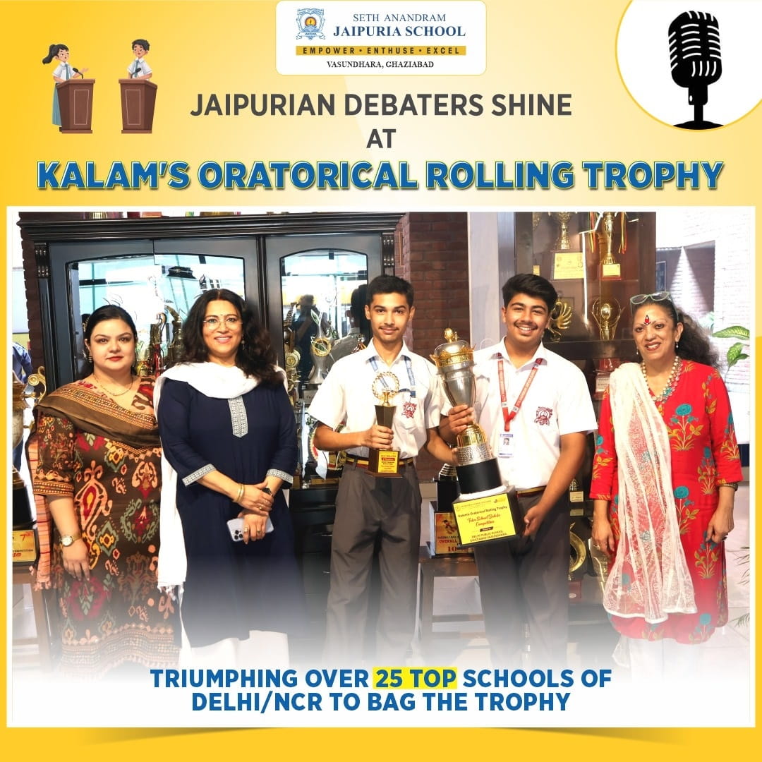 Seth Anandram Jaipuria School, Ghaziabad is proud to celebrate the stellar achievement of students Jagjeet Singh and Amolik Saraswat of Grade 11th, who triumphed at the Kalam’s Oratorical Rolling Trophy – Inter-School Debate hosted by DPSG Vasundhara. Competing against top debaters from 25 leading schools across Delhi NCR, they brought home the coveted Rolling Trophy along with individual accolades. Their eloquence, confidence, and critical think
