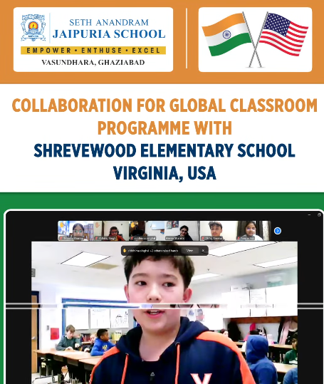 Global Exchange at Seth Anandram Jaipuria School, Ghaziabad! 🇮🇳🇺🇸 As part of the Global Classroom Programme, our Grade 6 students engaged in a dynamic ‘Meet and Greet’ session with peers from Shrevewood Elementary School, Virginia, USA. Coordinated by faculty Ms. Heena Sharma, the session fostered a vibrant exchange of ideas, cultural insights, and aspirations. Students discussed global issues, shared project ideas, and explored ways to contribute to the UN Sustainable Development Goals, embodying true global citizenship.