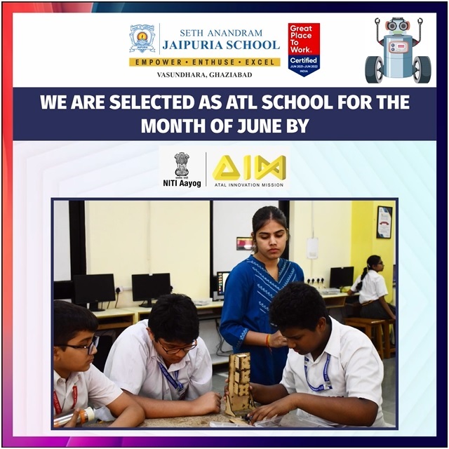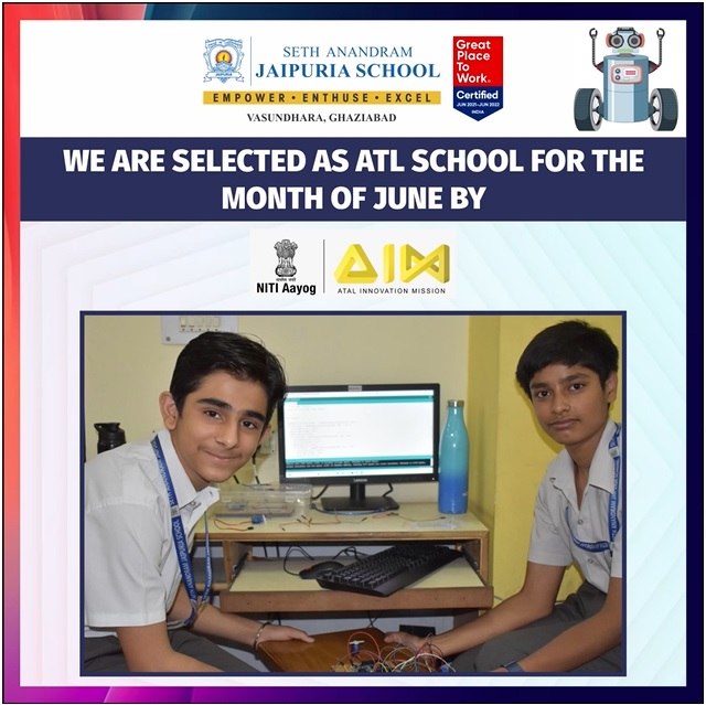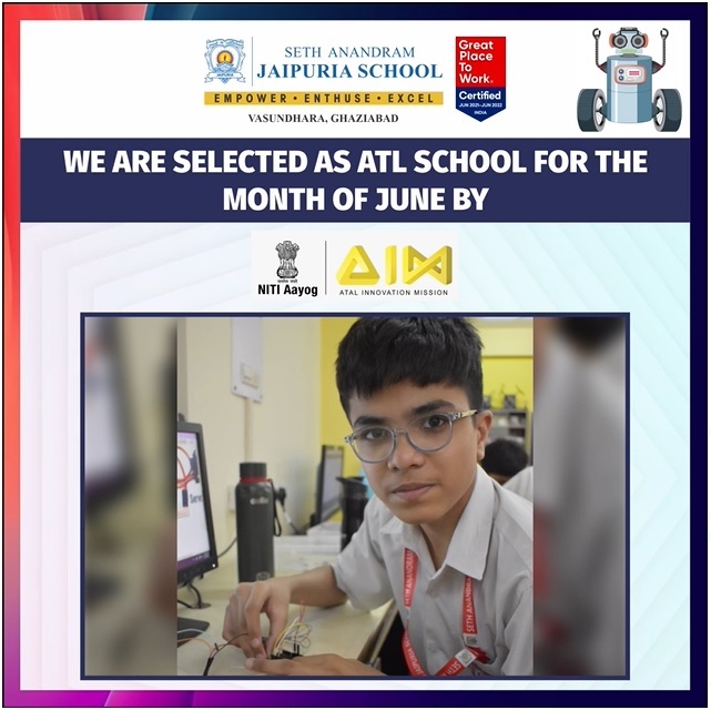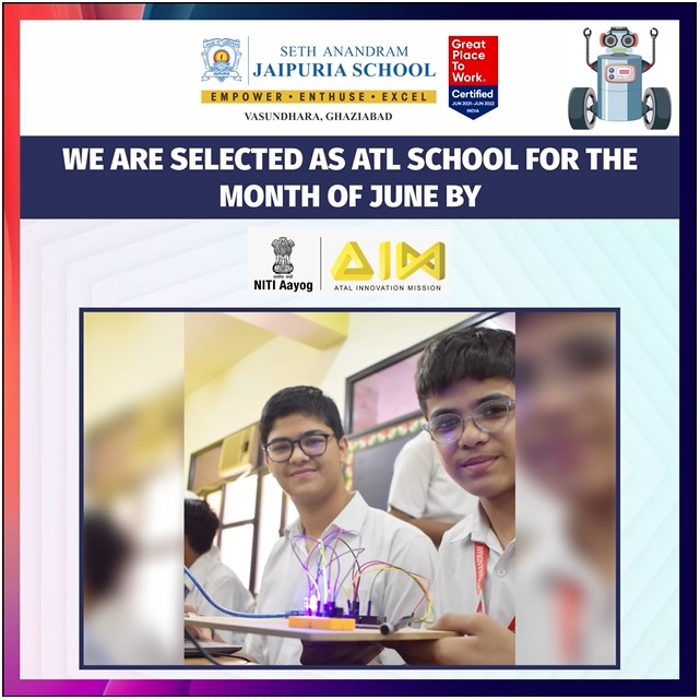 We are elated and honoured to announce that Seth Anandram Jaipuria School, Vasundhara, Ghaziabad, has been chosen as the ATL (Atal Tinkering Lab) school of the month of June by NITI Aayog and Atal Innovation Mission!