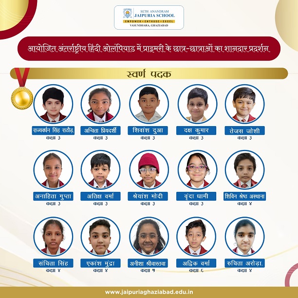 सेठ आनंदराम जैपुरिया स्कूल, ग़ाज़ियाबाद, के प्राइमरी वर्ग के छात्र-छात्राओं ने अंतरराष्ट्रीय हिंदी ओलंपियाड में उत्कृष्ट प्रदर्शन किया है। उनकी भाषिक क्षमता और ज्ञान का प्रदर्शन प्रशंसनीय है। हम अपने छात्र-छात्राओं की इस उपलब्धि का अभिनंदन करते हैं और उनकी लगन की सराहना करते हैं।