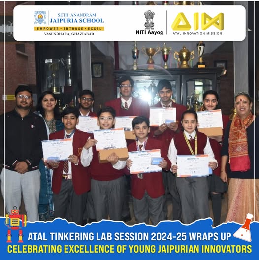 Seth Anandram Jaipuria School, Ghaziabad celebrates its top Atal Tinkering Labs (ATL) achievers from Grades 6-8 who demonstrated exceptional problem-solving prowess by conquering the most quizzes with highest scores across all sections. These young innovators received Robotics Kits sponsored by Rancho Labs, equipping them to continue their journey of creation and discovery. The school’s Atal Tinkering Lab program continues to nurture future leaders by fostering hands-on learning and technological curiosity in STEM fields.