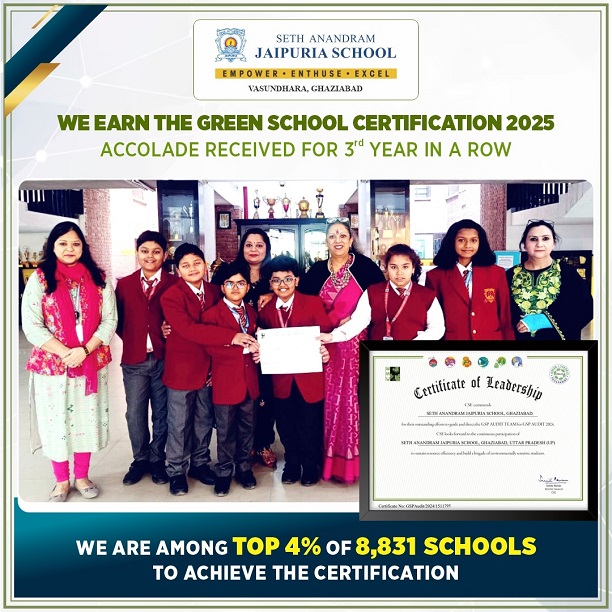 Seth Anandram Jaipuria School, Ghaziabad, is proud to receive the Green School Certification from the Centre for Science and Environment for the third consecutive year! Out of 8,831 schools, we are among the top 4% recognized for our commitment to sustainability.