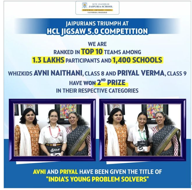 Seth Anandram Jaipuria School, Ghaziabad, proudly congratulates Avni Naithani (Class 8) and Priyal Verma (Class 9) for their incredible achievement at the prestigious HCL JIGSAW 5.0 competition! Out of 1,30,000 participants from 1,400 schools nationwide, they secured a place in the Top 10 teams, winning Second Place in their categories.