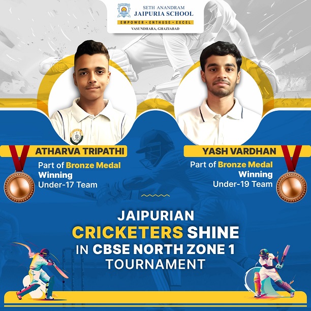 We are proud to share that Atharva Tripathi and Yash Vardhan of Seth Anandram Jaipuria School, Ghaziabad, brought laurels to the school by securing bronze medals in the CBSE North Zone 1 Cricket Tournament. Atharva was a part of the Under-17 team, while Yash represented the Under-19 team. Their dedication, discipline, and sportsmanship exemplify the spirit of Jaipuria. Congratulations to our rising stars!