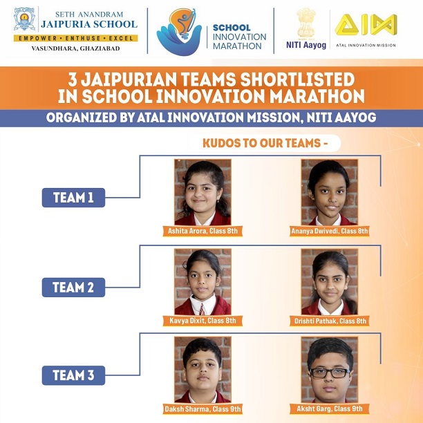 We are thrilled to announce that three teams from Seth Anandram Jaipuria School, Ghaziabad, have secured a spot in the Top 1500 of the prestigious School Innovation Marathon, organized by AIM (Atal Innovation Mission), NITI Aayog! Out of 30,000 teams & 500,000 students, our young innovators have showcased brilliant creativity & problem-solving skills, paving the way for real-world impact. Best wishes for the next round!
