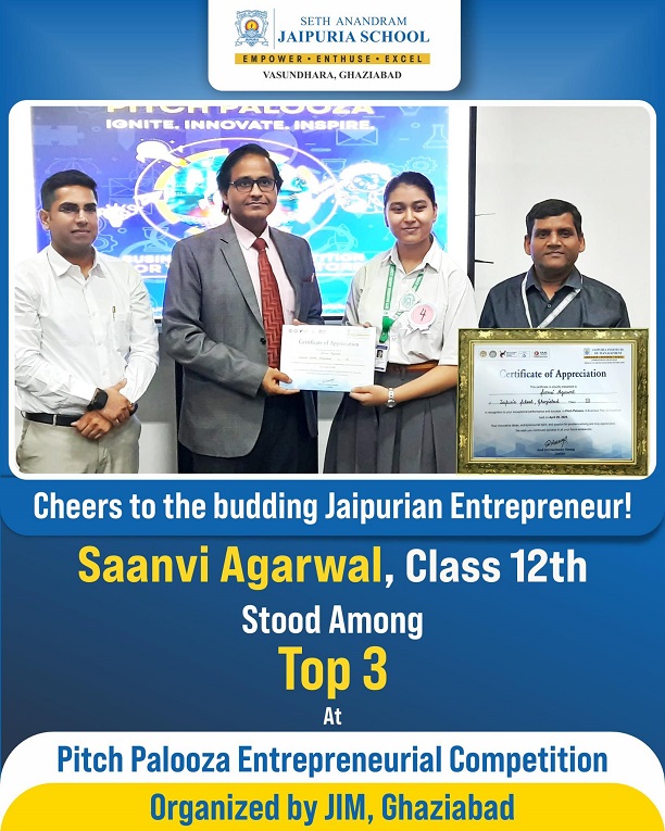 Kudos to Saanvi Agarwal of Class XII-J from Seth Anandram Jaipuria School, Ghaziabad, for her outstanding achievement at Pitch Palooza, held at Jaipuria Institute of Management, Ghaziabad! Competing among 15 teams from five leading schools, Saanvi secured a spot in the Top 3 Start-ups and won a cash prize, showcasing her sharp entrepreneurial vision. Her success reflects the spirit of innovation nurtured at Jaipuria!