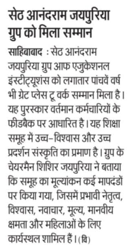 Link:- https://educationworld.in/seth-anandram-jaipuria-group-certified-great-place-to-work-for-fifth-year-in-a-row/