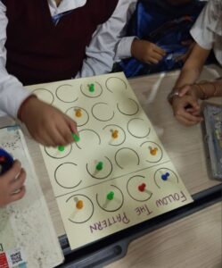 The activity was simple yet impactful. Students were given partially completed patterns and tasked with observing the sequence carefully before replicating it. What appeared to be a fun exercise had far-reaching benefits. By focusing on the details of the sequence and executing it accurately, students practiced key skills like patience, precision, and logical thinking.