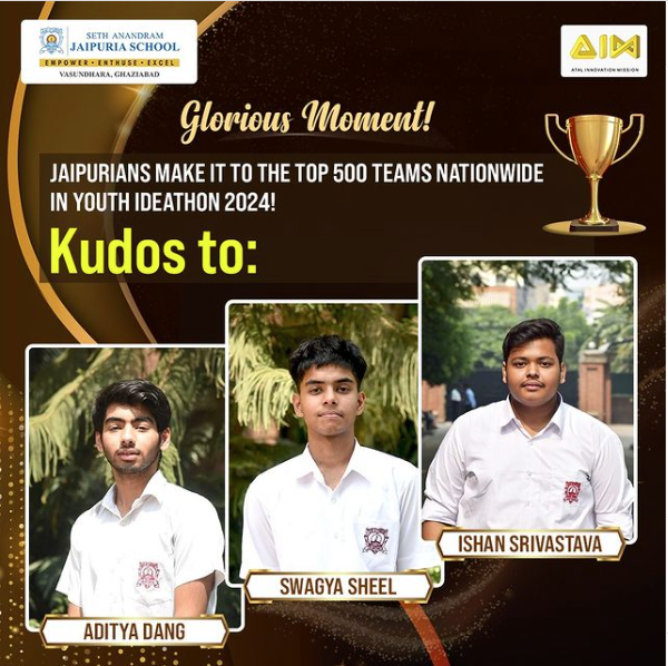 We are elated to announce that our talented students, Ishan Srivastava, Aditya Dang, and Swagya Sheel from Class 12, have made it to the top 500 teams nationwide in Youth Ideathon 2024!