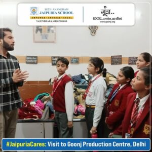 At Seth Anandram Jaipuria School, Ghaziabad, our young changemakers from Class V recently visited the Goonj Production Centre, Sarita Vihar, to donate clothes, stationery, and essentials collected during a heartfelt charity drive. This impactful visit allowed students to witness how their efforts contribute to bridging the urban-rural divide, fostering empathy and social responsibility. The warm welcome from Goonj’s team and insights into their noble work left our students inspired to continue making a difference in their community.